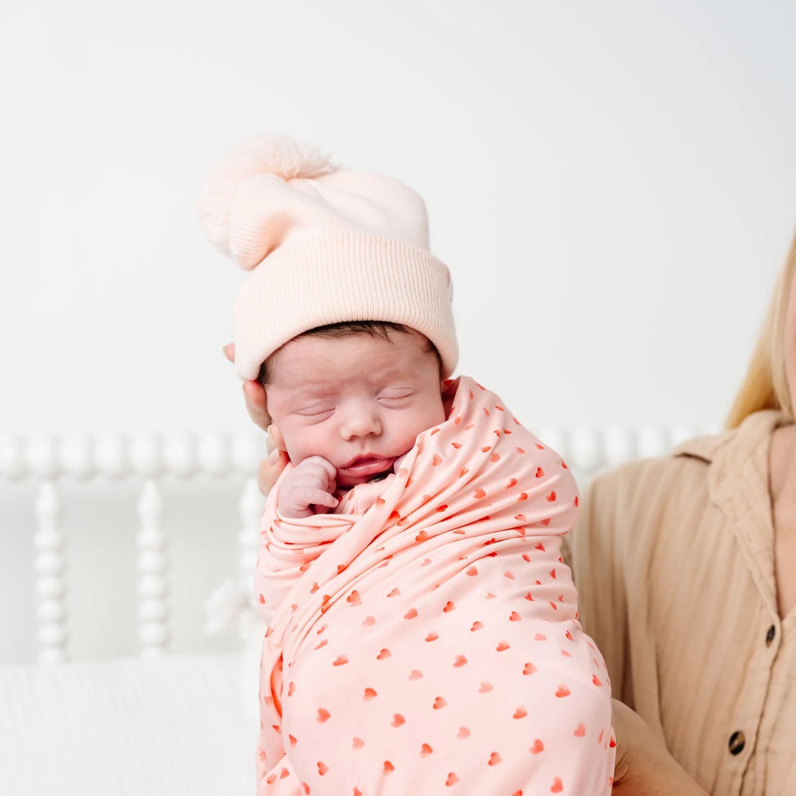 Stretchy, soft, and oh so warm, these beanies were designed and created to be worn over and over. With an adjustable cuff, you can wear it cap style or slouchy. Pompom or not, there is something cozy for everyone in the family. #twinning