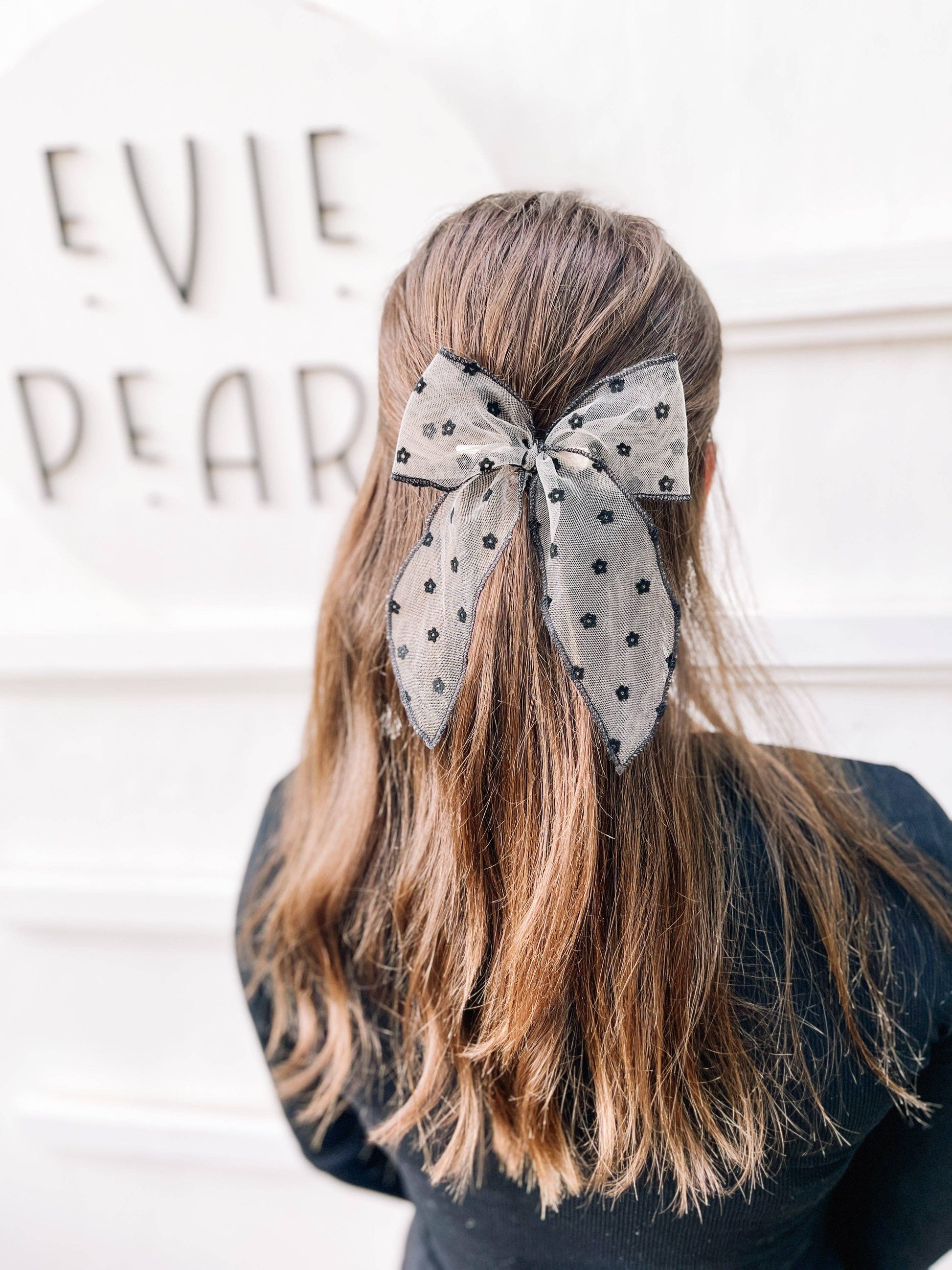 Make a statement with our oversized black sheer daisy flocked bow. This elegant 5” x 6” hair bow features delicate daisy accents on soft sheer fabric, attached to a right-side alligator clip for a secure hold. Perfect for toddlers, girls, and women looking to add a bold yet feminine touch to any outfit year-round.