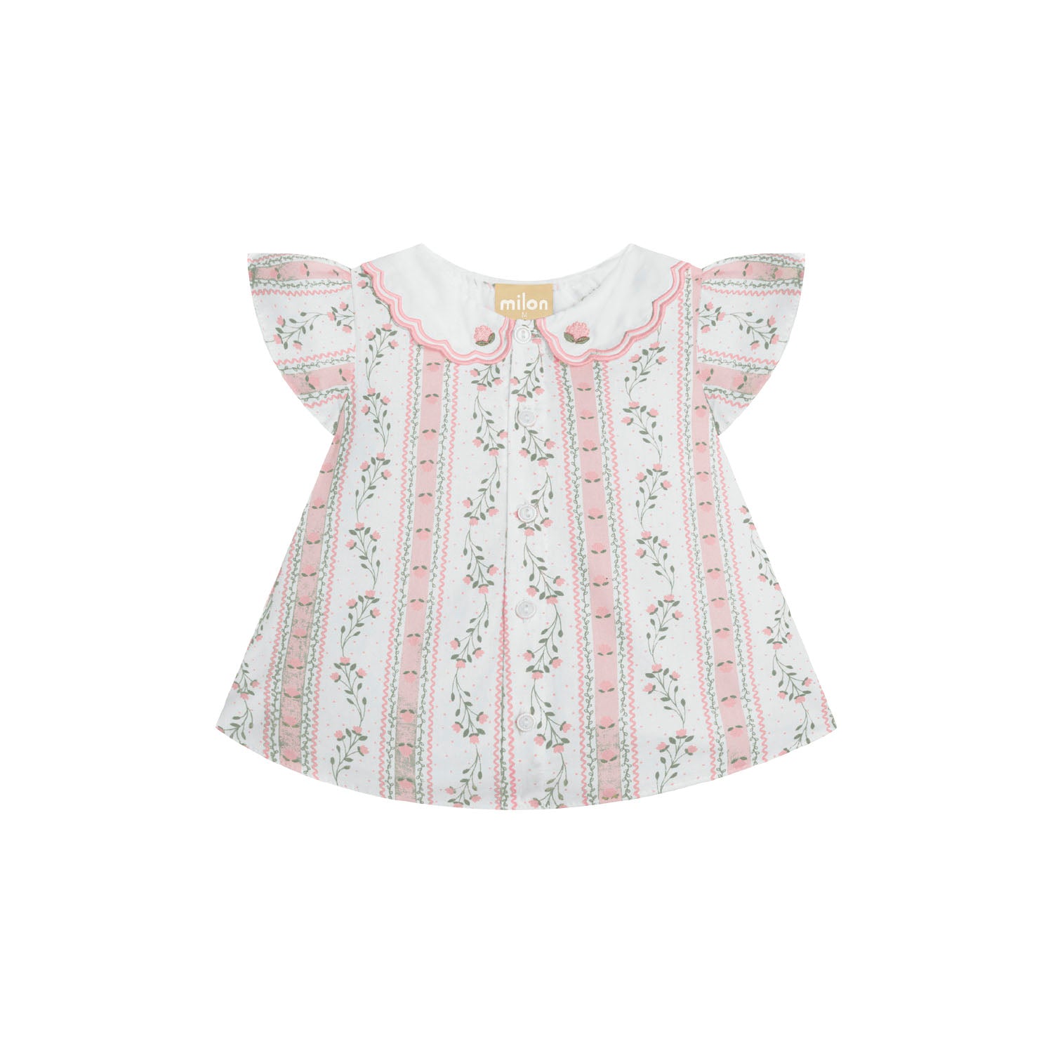 This charming two-piece set features a delicate floral blouse paired with soft, gathered bloomers for a timeless look. The flutter sleeves, scalloped collar, and button-front detail add vintage-inspired charm, while the lightweight fabric keeps little ones comfortable all day. Finished with an elastic waistband and gentle ruffle trim, this set is perfect for warm days, special moments, and everyday sweetness.