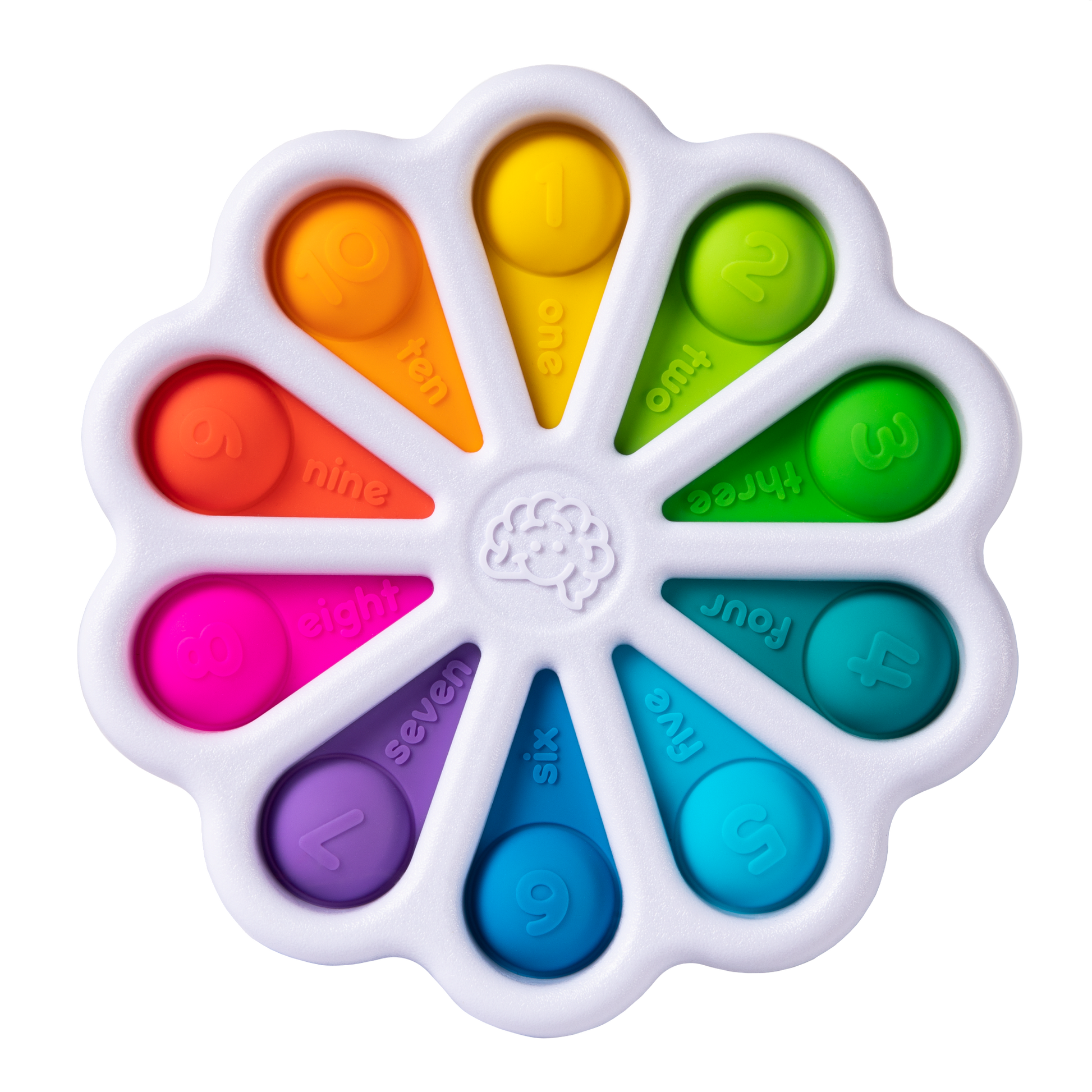 Touch, push, pop, and learn! Squishy, silicone bubbles captivate the fingers in a way that's impossible to put down while simultaneously opening a unique new avenue for learning. On one side, the bubbles are embossed with the numerals 1 through 10, each accompanied by its matching word in English. Flip it over and you'll find the words written in Spanish, plus dots to feel and count! Colorful, unique, and wonderfully tactile - Little fingers can't resist the number-learning delight of Dimpl Digits.
