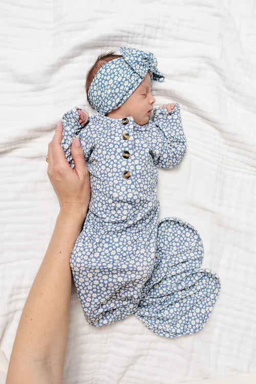 The easiest tie-bottom outfit for day or night. Made for hassle free diaper changes and gentle dressing, I designed this with a button-down front and tie bottom for simple closure (no more snaps at 2am!). Fold over wrist cuffs are the most thoughtful finishing touch.