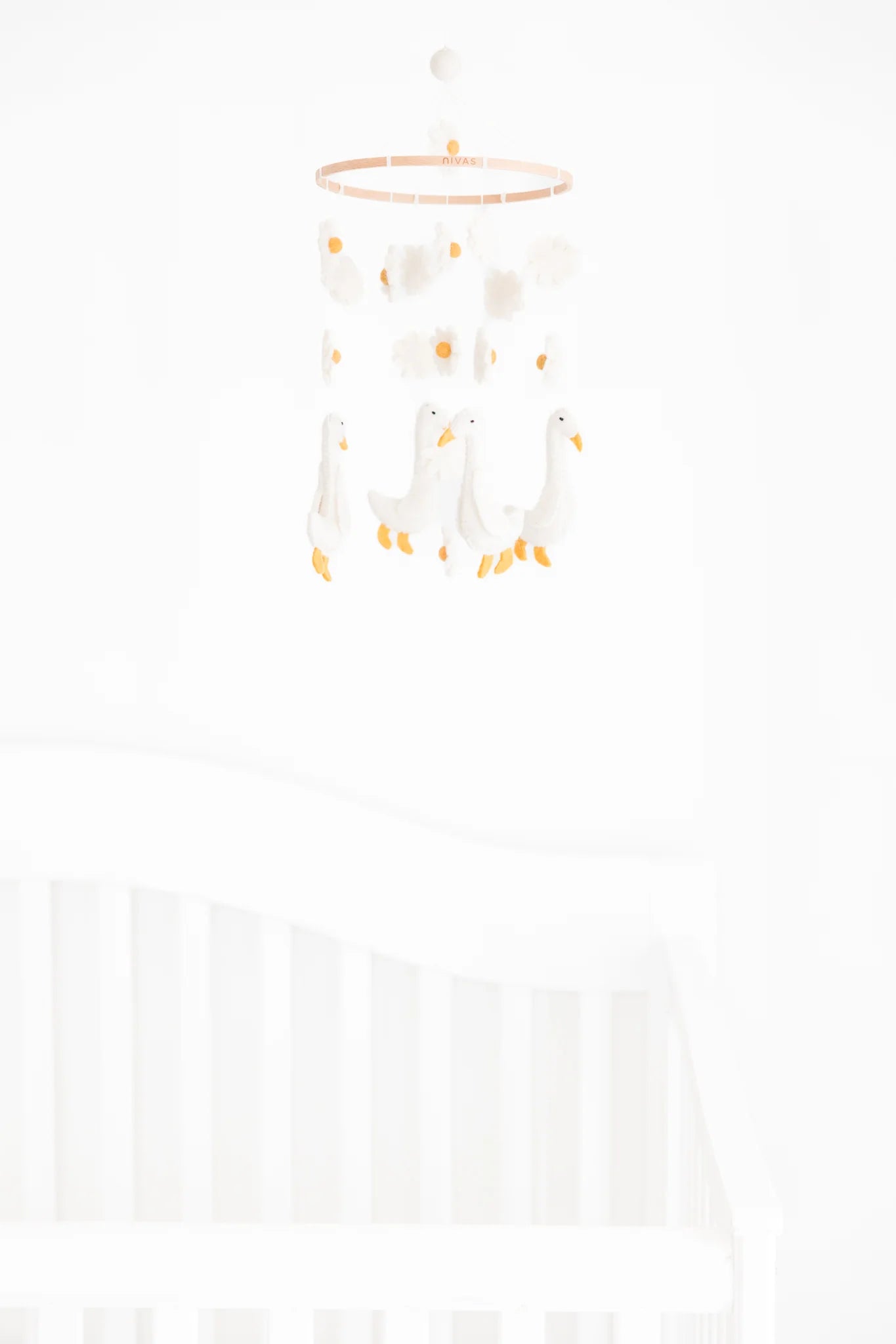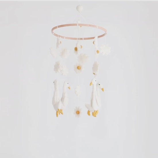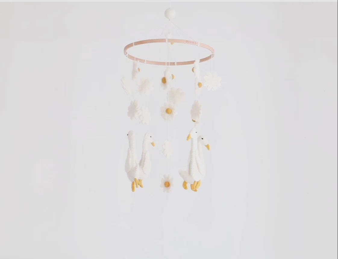 Featuring sweet, fluffy ducks gliding through dainty daisies with soft, delicate petals, the mobile’s design evokes the peaceful beauty of nature. The vibrant daisies enhance the playful yet serene theme, making it an ideal addition to springtime nurseries or flower-themed décor. The soothing motion and soft colors of the mobile create a calm environment, while also sparking curiosity and joy for your baby.
