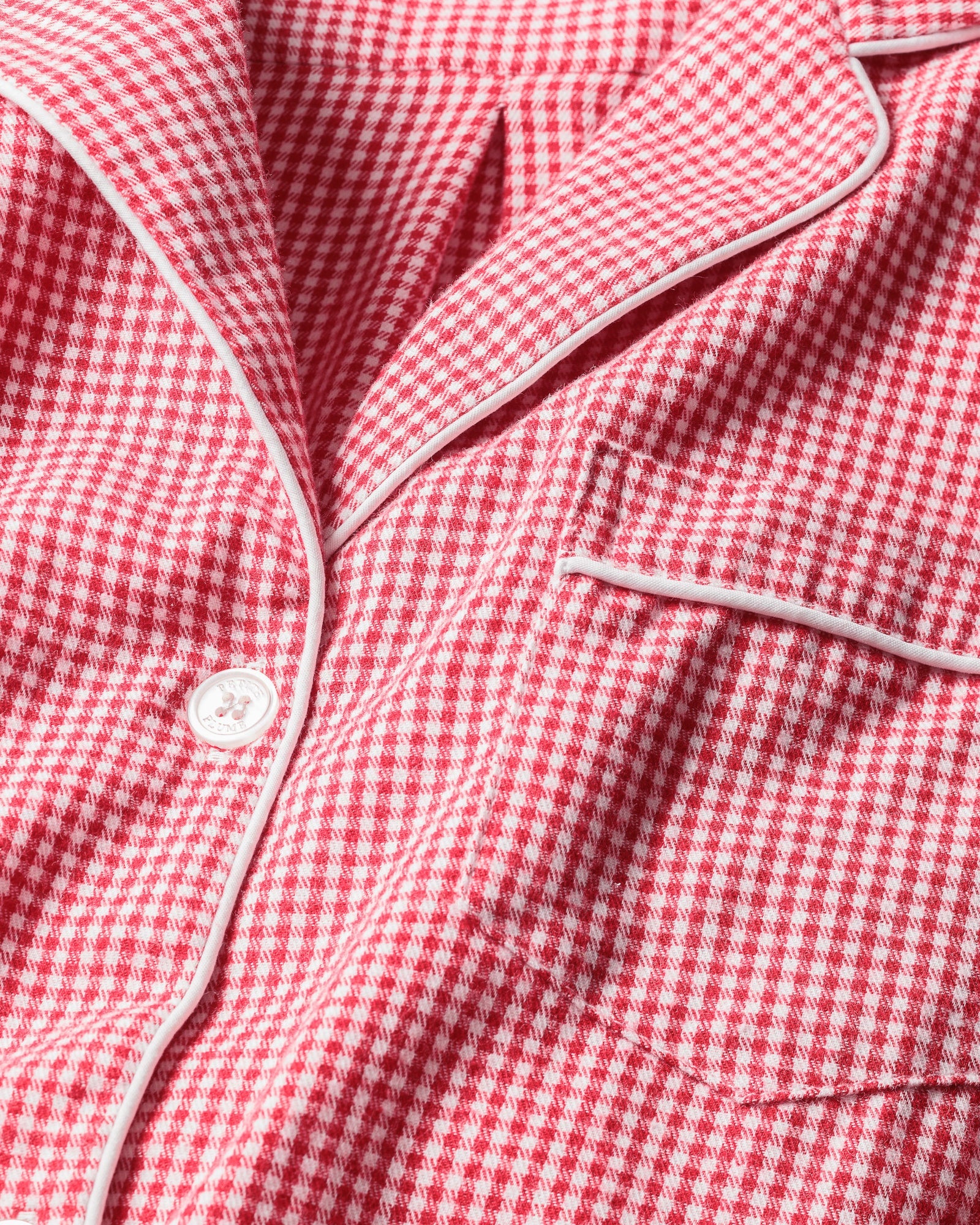 This pajama set is classic and never goes out of style. Gingham print dating back to the 17th century is a staple. This classic pajama set is accented with white piping and finished with pearl buttons. This pajama is a lightweight, very soft flannel.