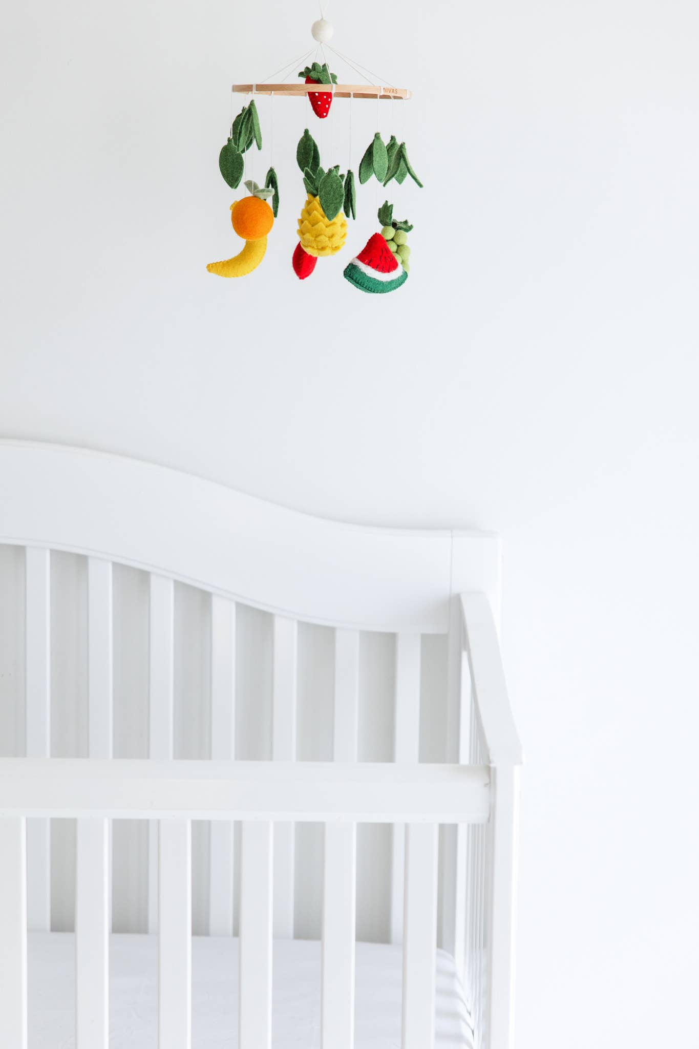 Fruit crib mobile with banana, pineapple, apple, watermelon, grape, and orange. Handmade felt baby mobile. Wool felt fruit mobile. Colorful fruit-themed nursery décor. Tropical fruit baby mobile. Citrus and berry nursery decoration. Banana and pineapple mobile. Watermelon and grape baby mobile. Apple and orange nursery décor. Baby girl or boy nursery mobile. Gender neutral baby mobile. Soft felt hanging mobile. Mobile for baby crib. Reusable nursery décor. Baby shower gifts. Newborn gifts. Infant baby gifts. New baby presents. Montessori and sensory play. Handmade baby mobile. Artisan nursery line. Artisan baby products. Modern nursery décor.