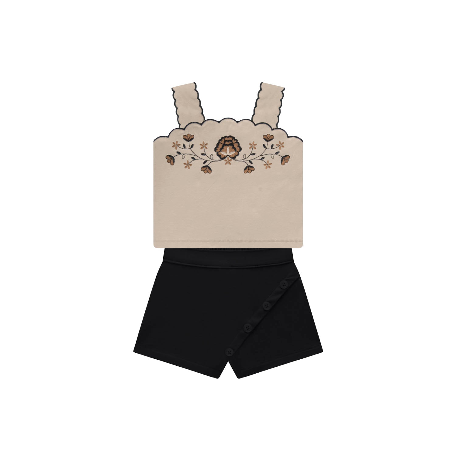 This refined two-piece set blends timeless elegance with everyday comfort. The scalloped tank top features delicate floral embroidery and softly structured straps for a vintage-inspired look, while the coordinating skort offers the appearance of a wrap skirt with the ease and comfort of built-in shorts. Lightweight and easy to wear, this set is perfect for special outings or elevated everyday styling with a polished, boutique finish.