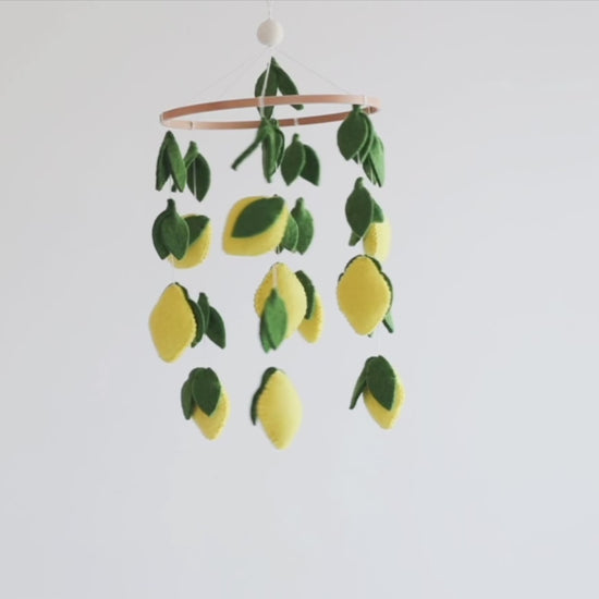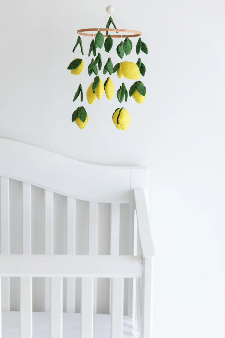 Fresh and fun, our handmade lemon crib mobile brings a burst of citrus to your baby's nursery. Featuring soft felt lemons and leaves, this cheerful mobile adds a playful yet soothing atmosphere above a crib or changing table. Ideal for citrus-themed baby showers or bright, sunny nurseries.