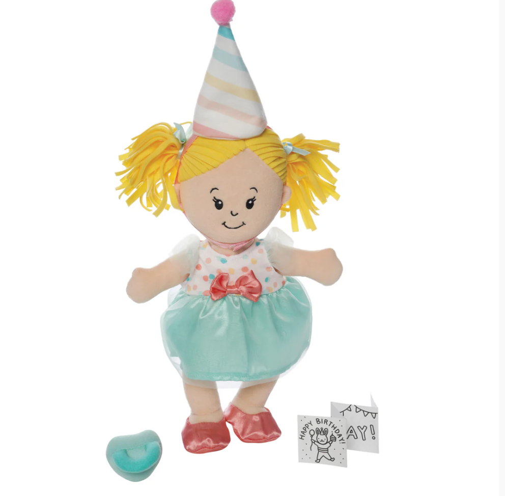 Happy birthday! This set has everything little ones need to have a birthday celebration. Including doll-size accessories like a dress, shoes, birthday hat and a signature magnetic pacifier. Plus, a DIY birthday card for kids to color. Magnetic pacifier is
