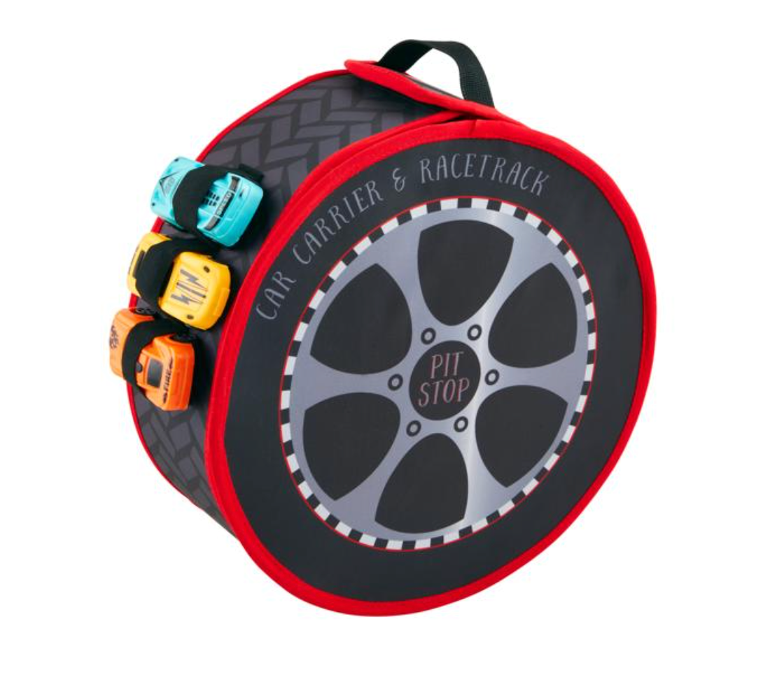 - Car storage carrying case that unzips to reveal a racetrack and parking lot