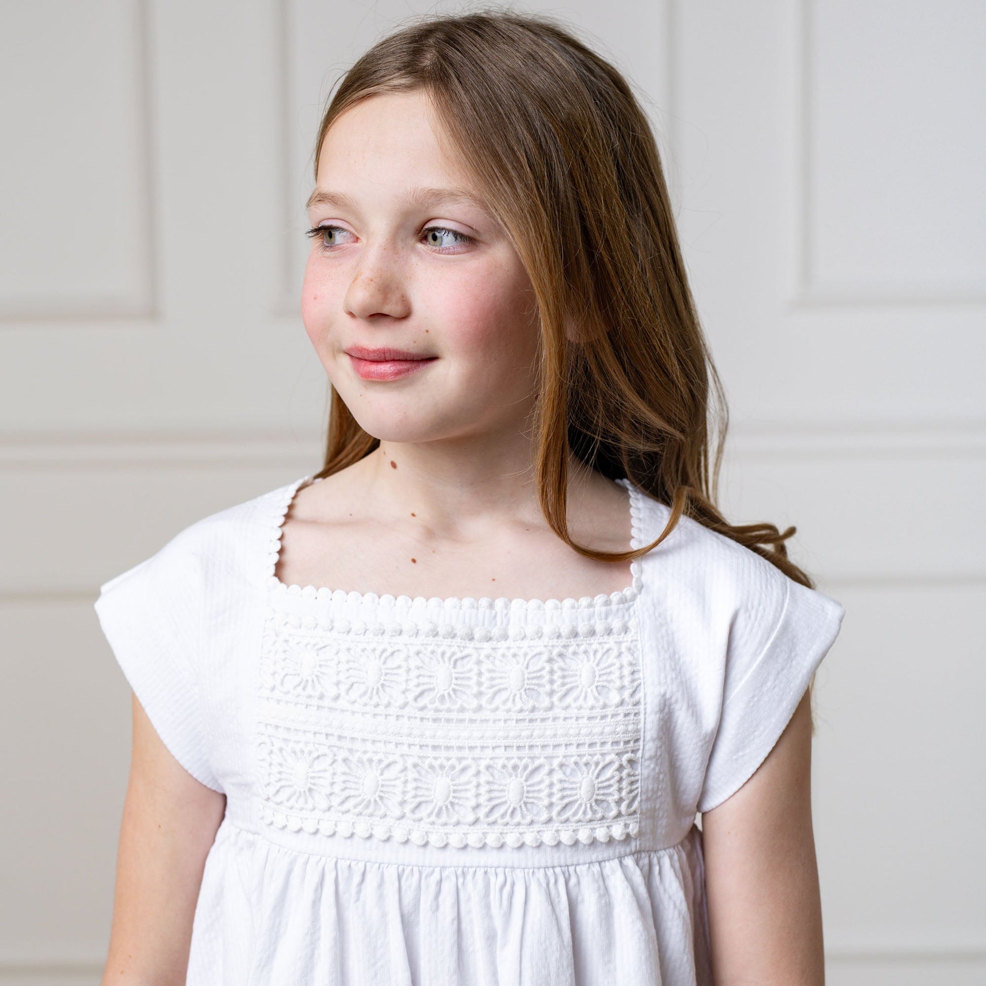 A beautiful crochet detail bodice is the standout feature of our empire waist sundress for summer. Crafted from soft organic cotton seersucker, this dress is has petite cuffed sleeves, is fully lined in organic cotton and has a zipper closure down the center back. The swingy silhouette is perfect for everything from picnics to parties to wedding celebrations.