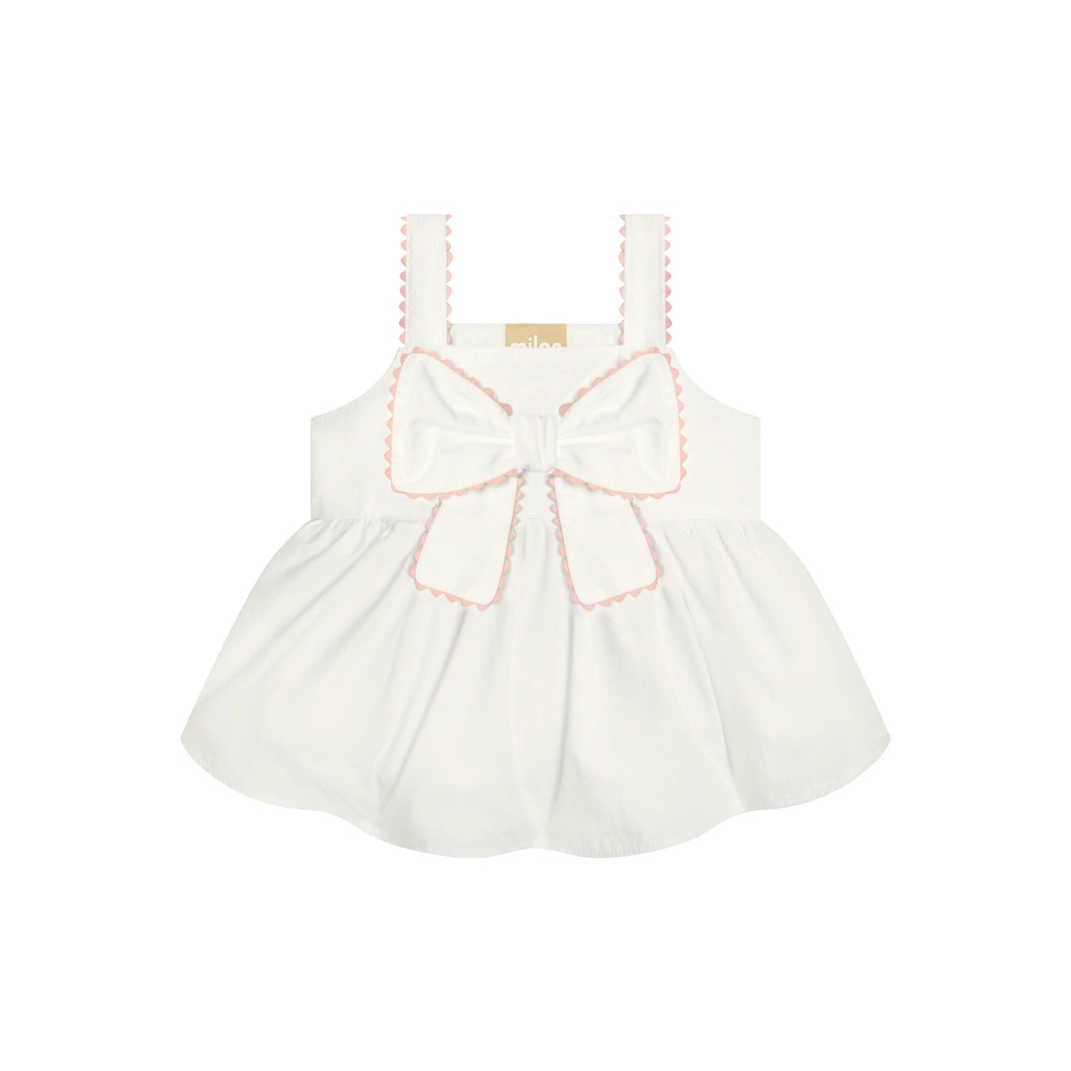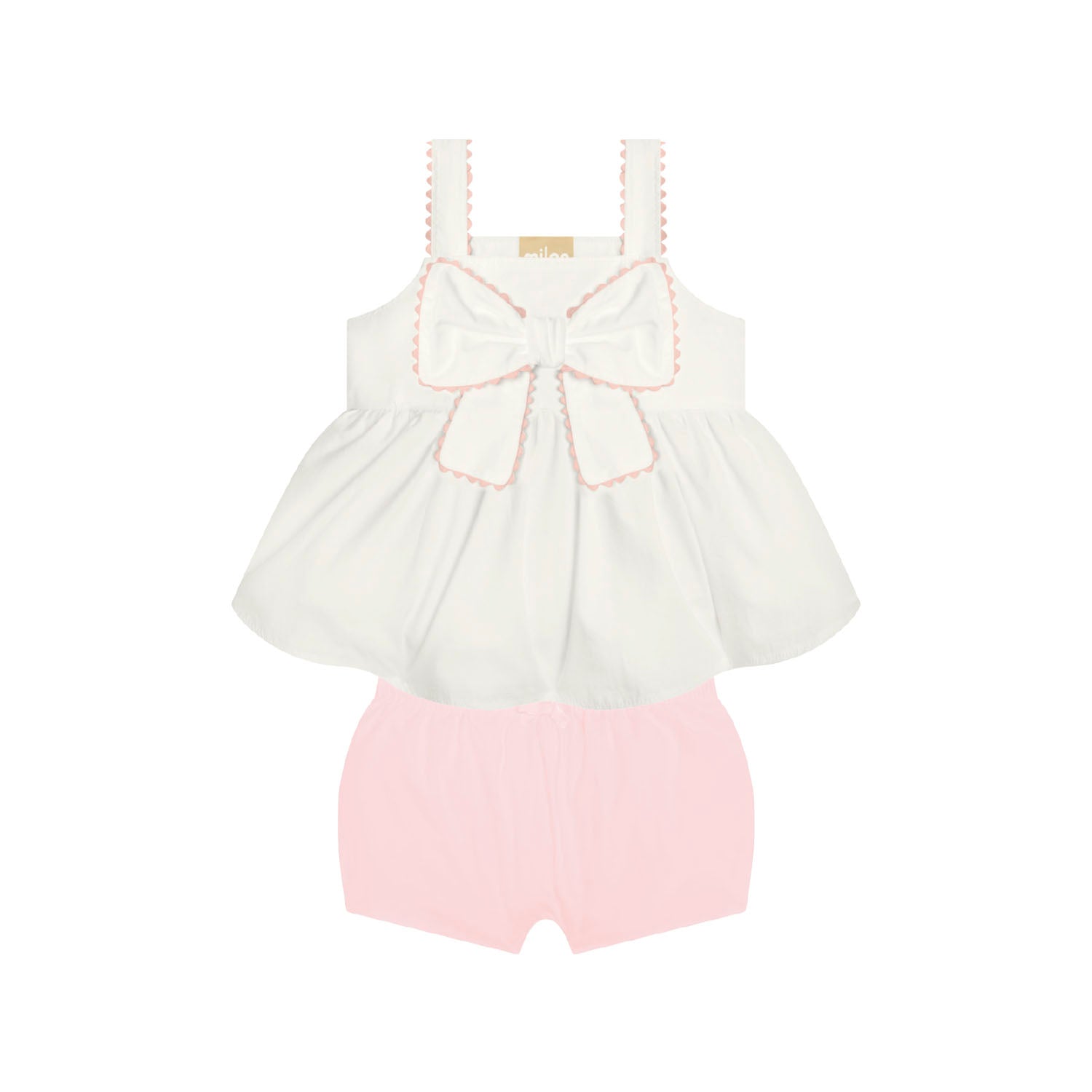 This little set is all about charm and clean, classic details. The white top has the sweetest scalloped trim along the straps and bow, giving it a crisp, put-together look without trying too hard. The big front bow feels fun and playful, but the navy edging keeps it super polished.