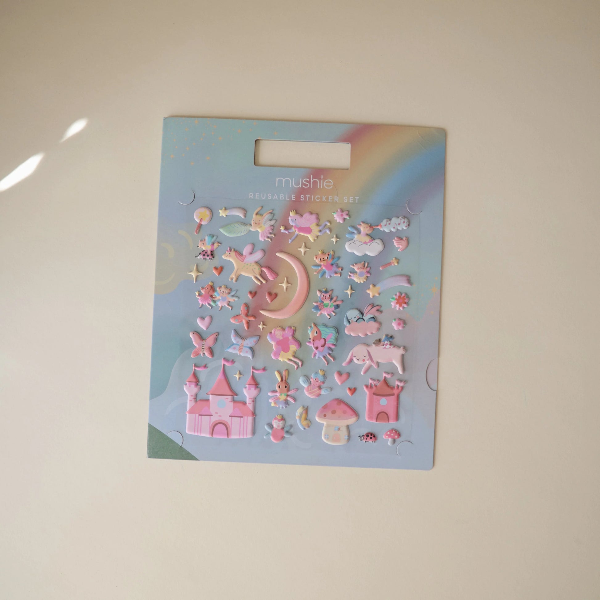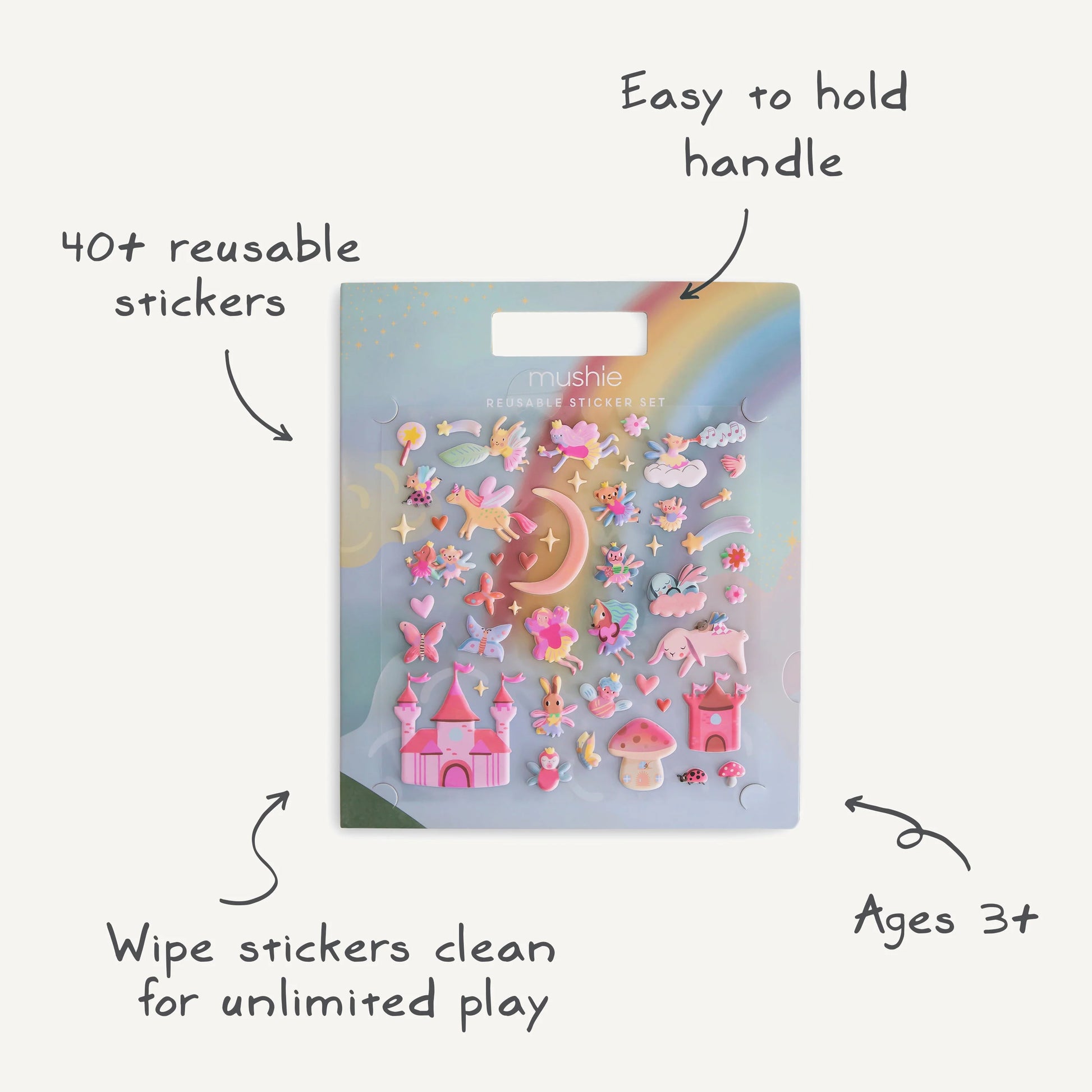 Set the stage for imaginative storytelling with a reusable sticker book that features enchanted themes and magical scenes. With puffy stickers that can be used over and over again, kids will enjoy pretend play with fairy princesses and charming forest creatures. The simple carrying handles let you take playtime anywhere with easy-to-hold cutouts at the top of the book. Watch littles act out countless adventures as they move stickers around the book and explore.
