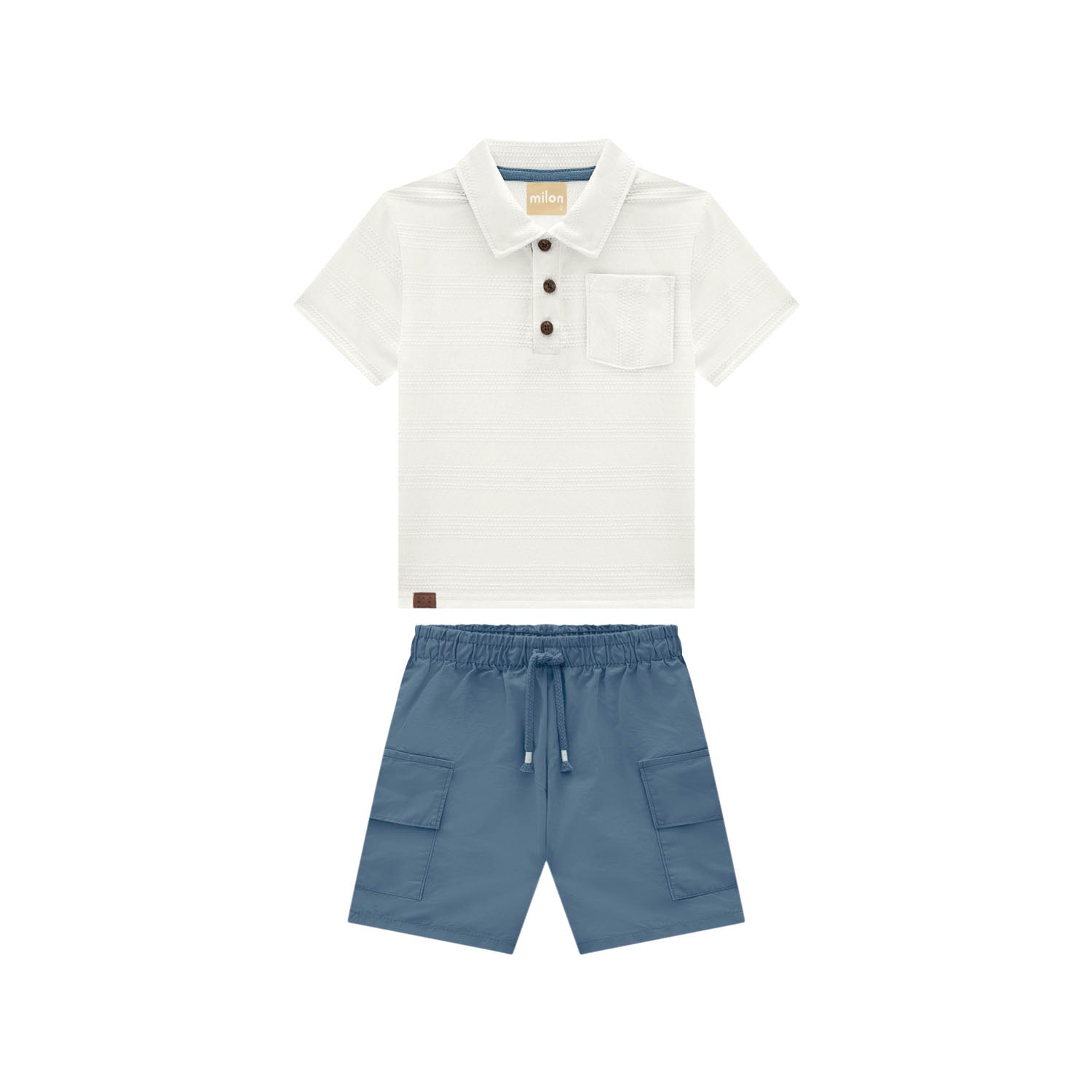 Simple, timeless, and effortlessly cute — this set is an easy warm-weather go-to. The textured white polo brings a crisp, dressed-up feel with its wooden-style buttons and little chest pocket, giving your kiddo that “looking put together without even trying” look. Paired with the soft blue cargo shorts, you get comfort, stretch, and plenty of room for treasures thanks to the roomy pockets.