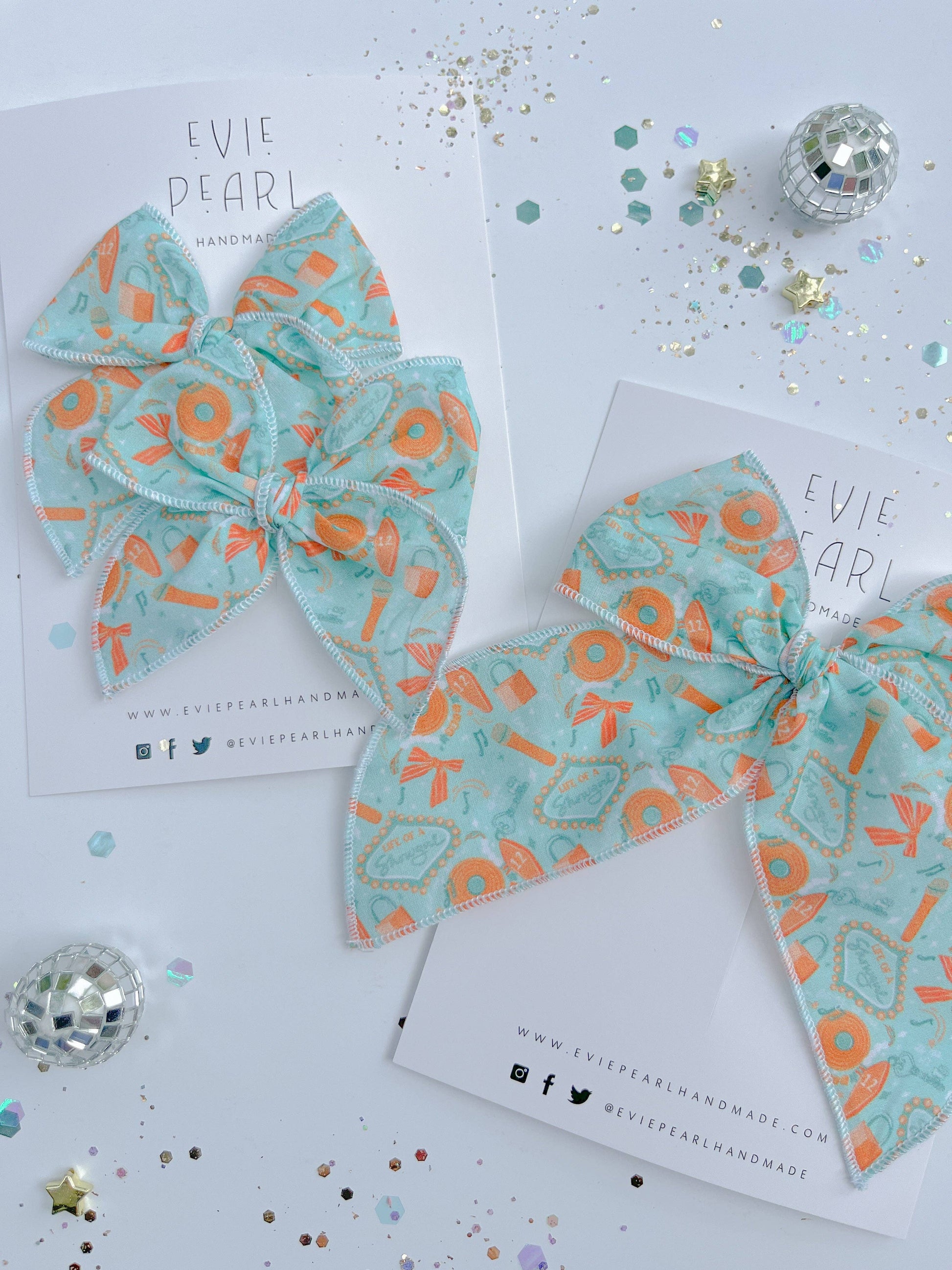 Step into the spotlight with our brand-new Showgirl Collection, designed for every true Swifty! ✨ This teal and orange collection is bursting with must-have handmade hair accessories including headbands, oversized scrunchies, statement bows, pigtail clips, claw clips, and shimmering hair glitter. Inspired by the magic of Taylor Swift’s fearless style and bold stage looks, these pieces add a pop of color and sparkle to every outfit.