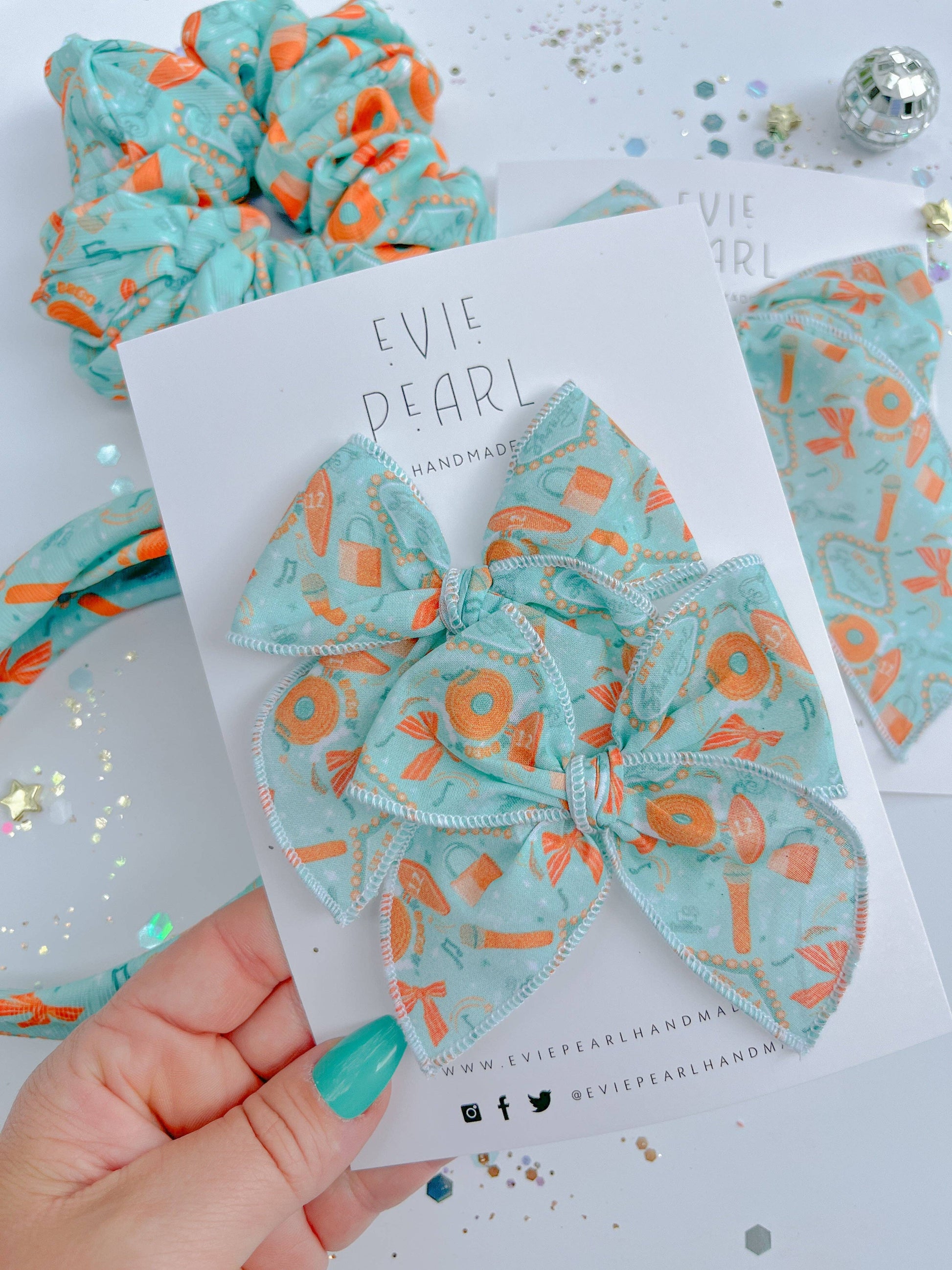 Step into the spotlight with our brand-new Showgirl Collection, designed for every true Swifty! ✨ This teal and orange collection is bursting with must-have handmade hair accessories including headbands, oversized scrunchies, statement bows, pigtail clips, claw clips, and shimmering hair glitter. Inspired by the magic of Taylor Swift’s fearless style and bold stage looks, these pieces add a pop of color and sparkle to every outfit.