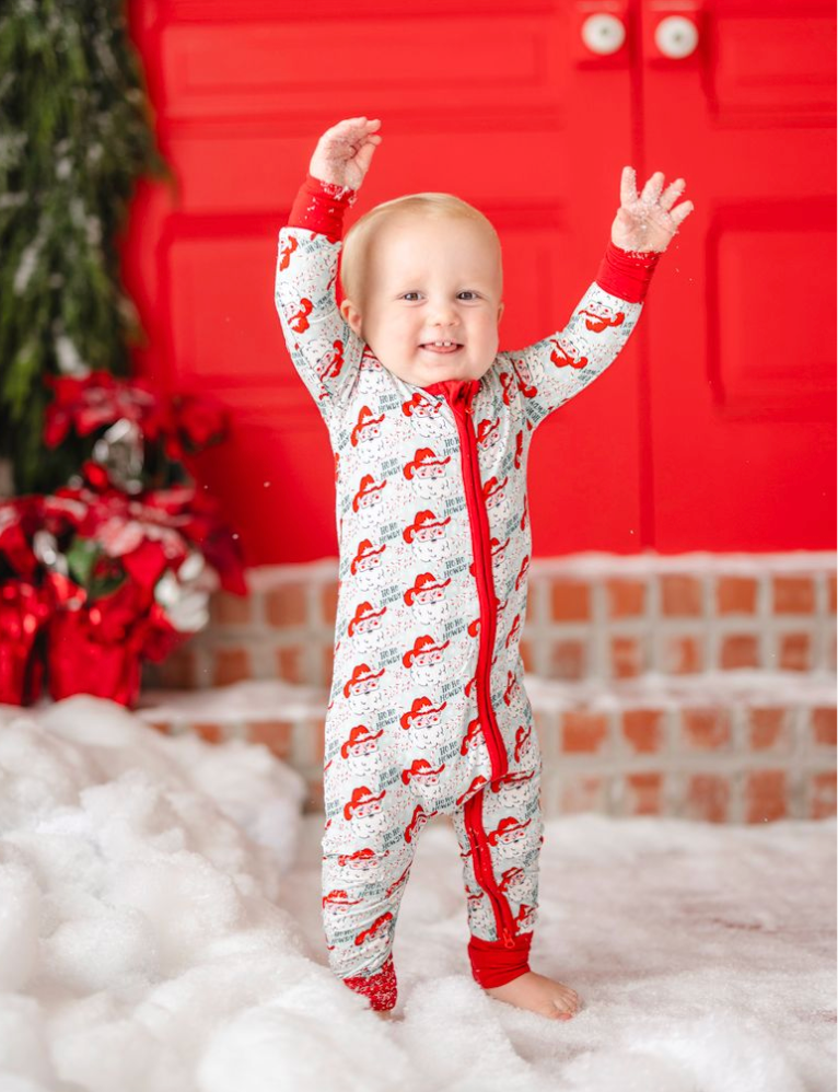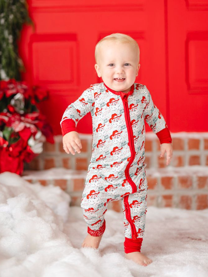 Yeehaw! Get ready to saddle up for the cutest Christmas ever with our Ho Ho Howdy Santa Zipper Romper! Perfect for your little cowboys and cowgirls, these jammies feature a jolly Santa bringing festive cheer straight from the North Pole to the Wild West!